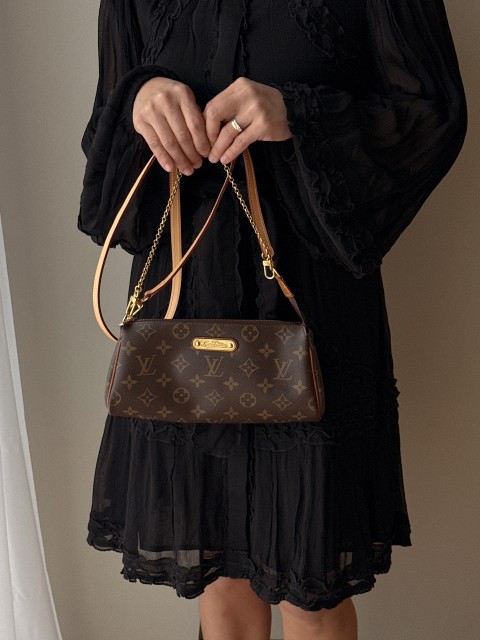 Eva-modellen er kjent for sin allsidighet og kan bæres både som clutch, skulderveske eller crossbody med avtagbar stropp. Den tidløse Monogram-canvasen gir vesken et klassisk og stilrent uttrykk.